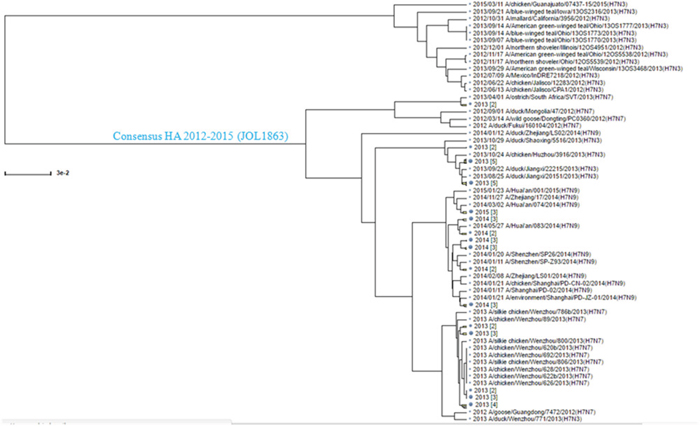 Figure 1: Phylogenetic analysis of the H7N1, H7N7, and H7N9 HA sequences. The HA sequences of H7N1, H7N7, and H7N9 available in the Influenza Virus Resource data base in early 2012-2015 were aligned by Clustal W algorithm, and a consensus sequence was generated. The consensus sequence used in this study is shown in blue with the bacterial strain name indicated in parentheses.