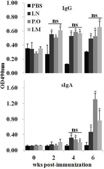 Figure 3: Effect of JOL1863 vaccination on the systemic IgG and mucosal IgA responses. Immunization of chickens with JOL1863, delivered nasally (I.N), orally (P.O) or intramuscularly (I.M), improved both anti-IgG and anti-IgA antibody responses. The antibody IgG and sIgA levels were measured in serum and intestinal wash samples, respectively, at different time points post-vaccination by indirect ELISA. Each data points represent mean ± SD of five chickens per group. *p < 0.05. ns, non-significant.