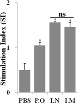 Figure 4: In vitro proliferations of lymphocytes from vaccinated chickens in response to recall HA antigen. PBMCs from vaccinated chickens were restimulated with HA antigen (10 μg/ml) for 72 hours and lymphocyte proliferation was determined by MTT assay. Results are expressed as stimulation indices, defined as proliferation in response to recall antigen relative to the mock stimulated cells. Each data points represent mean ± SD of five chickens per group.*p < 0.05. ns, non-significant.