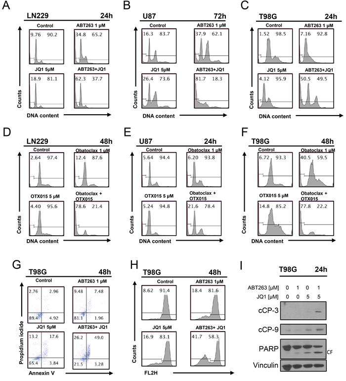 Figure 2: Combined treatment with JQ1 and ABT263 yields enhanced induction of apoptosis. A., B., C. representative histograms of LN229, U87 and T98G glioblastoma cells that were treated for the indicated time points as indicated with JQ1, ABT263 or both prior to staining with propidium iodide and flow cytometric analysis. D.-F., LN229, U87 and T98G glioblastoma cells were treated for the indicated time points as indicated with OTX015, Obatoclax or the combination. G., representative histograms of T98G glioblastoma cells treated with ABT263, JQ1 or the combination as indicated for 48h prior to staining for annexin V and propidium iodide and flow cytometric analysis. H., representative histograms of T98G glioblastoma cells that were treated with JQ1, ABT263, or both prior to staining with TMRE and flow cytometric analysis. I., T98G glioblastoma cells were treated for 24 h with JQ1, ABT263 or the combination. Whole-cell extracts were examined by Western blot analysis for PARP, cleaved caspase 9 (C9) and cleaved caspase 3. Vinculin Western blot analysis was performed to confirm equal protein loading.