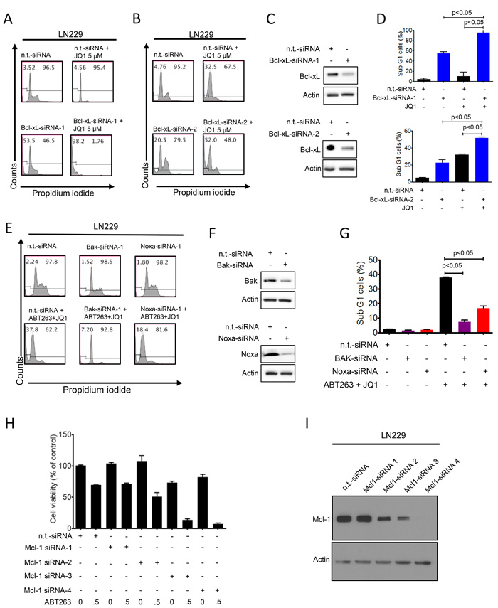 Figure 4: Functional implications of Bcl-2 family members in the combined treatment of ABT263 and JQ1. A.-D., Representative flow plots of LN229 cells that were treated with n.t.-siRNA or 2 different Bcl-xL siRNAs prior to additional treatment with either solvent or JQ1. Staining for propidium iodide and flowcytometric analysis was performed to determine the fraction of subG1 cells. The results were quantified (D). Knockdown of Bcl-xL was confirmed by Western Blot analysis (C). Actin served as loading control (C). E.-G. LN229 cells were treated with n.t.-siRNA or Noxa-siRNA or Bak-siRNA prior to treatment with solvent or the combination of 1µM ABT263 and 5µM JQ1 as indicated for 24 h. Staining for propidium iodide and flow cytometric analysis was performed to determine the fraction of subG1 cells. Representative flow plots are shown (E). The quantifications are shown in (G). Noxa and Bak knockdowns were confirmed by Western blot analysis (F). H., LN229 cells were transfected with n.t.-siRNA or four individual Mcl-1 siRNAs for 48h. Subsequently, cells were treated with ABT263 and analyzed by CellTiter-Glo assay. The concentrations for ABT263 are in µM. Column: mean. Error bar: standard deviation (SD). I., LN229 cells were transfected as in G and analyzed for protein expression of Mcl-1. Actin served as a loading control.