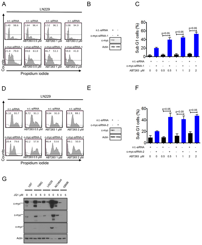 Figure 5: Silencing of c-myc sensitizes for Bcl-xL inhibition. A., LN229 cells were transfected with n.t.-siRNA or c-myc-siRNA-1 prior to treatment with solvent or ABT263 as indicated for 24 h. Staining for propidium iodide and flow cytometric analysis were performed to determine the fraction of subG1 cells. Representative flow plots are shown. The quantifications are shown in C. c-myc knockdown was confirmed by Western blot analysis B. D., LN229 cells were transfected with n.t.-siRNA or c-myc-siRNA-2 prior to treatment with solvent or ABT263 as indicated for 24 h. Staining for propidium iodide and flow cytometric analysis were performed to determine the fraction of subG1 cells. Representative flow plots are shown. The quantifications are shown in F. c-myc knockdown was confirmed by Western blot analysis E. G. U87, T98G, LN229 (established glioblastoma cells), NCH644 (stem cell-like glioma cells) and GBM6 (patient-derived xenograft) cells were treated with JQ1 for 72 hours. Protein extracts were prepared and samples were analyzed by conventional western blot analysis for the expression of c-myc. Actin serves as a loading control. Multiple exposures are presented due to the fact that cells express different baseline levels of c-myc. * indicate different exposure times for c-myc protein.