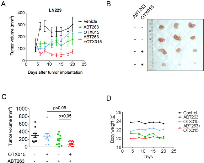 Figure 6: Combined treatment with ABT263 and OTX015 leads to a regression of glioblastoma xenograft tumors. A.-D., 1x106 LN229 glioblastoma cells were implanted subcutaneously. After tumor formation, groups were formed. Treatment was started on day 4 and suspended on day 20. Animals were treated intraperitoneally with vehicle (n = 9), OTX015 (37.5 mg/kg) (n = 9), ABT263 (37.5 mg/kg) (n = 9) or both agents n = 12) (5 days on, 2 days off). Tumor growth curves show the development of tumor size for each treatment group. Data are presented as mean and SEM. B, Photograph of representative tumors is shown. C, Scatter plots display the quantitative representation of the tumor size among the different treatments toward the end of the experiment. Data are presented as mean and SEM D, Body weights of the animals are provided throughout of the treatment (B). Days are meant as “Days after tumor implantation”. Shown are means. Control group is the same as in A (Vehicle = Control).
