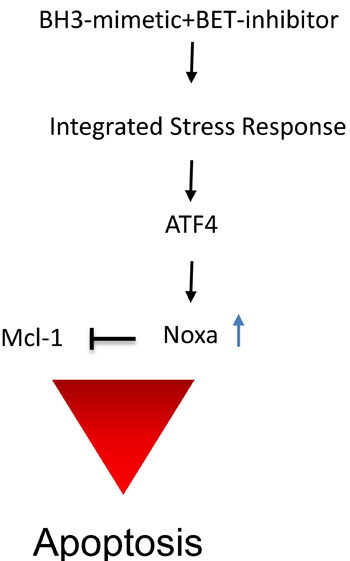 Figure 7: Summary of the proposed mechanism of action by the drug combination. The combination treatment of BET-inhibitors and BH3-mimetics causes a stress response with an increase of ATF4 and subsequent up regulation of pro-apoptotic Noxa, interfering with Mcl-1 function, leading to induction of apoptosis.