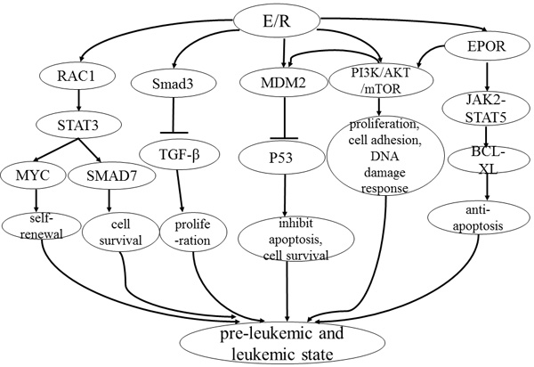 Figure 2: Model for pathways influenced by E/R. 1) E/R regulates the phosphorylation of STAT3 via activation of RAC1, resulting in the transcriptional induction of MYC. 2) E/R can bind to a principal TGF-β signaling target, Smad3, which has an inhibitory impact on the response to TGF-β signaling. 3) E/R can upregulate MDM2 promoter activity; MDM2 functions as a crucial negative regulator of p53, repressing its activity. 4) E/R activates PI3K/AKT/mTOR signaling and interferes with proliferation, cell adhesion and DNA damage response. Activation of PI3K/AKT/mTOR signaling also promotes the phosphorylation of MDM2 and its localization in the nucleus where it binds to p53. 5) E/R can directly bind the EPOR promoter and increase cell survival through activation of the JAK2-STAT5 pathway and upregulation of antiapoptotic BCL-XL. EPOR is also one of the upstream signaling components of the PI3K/AKT/mTOR signaling cascade. All these signal pathways facilitate the E/R pre-leukemic state.