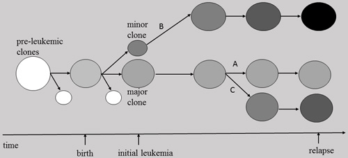 Pediatric ETV6/RUNX1-positive leukemia generally has favorable long-term remission and survival rates [96], but as in ALL initial manifestation, ETV6/RUNX1 is the most common structural genetic aberration in childhood B-cell precursor (BCP) ALL at first relapse [97]. Only 10% of E/R-positive relapses occur early, and very early relapses are rare. In most patients relapses occur several years after cessation of treatment [98], and occasionally after 10-20 years [99]. Relapsed childhood ETV6/RUNX1-positive leukemia is a clinically and biologically heterogeneous disease. A variety of studies have focused on the relationship between the clones giving rise to the primary and recurrent leukemias, as well as the molecular abnormalities responsible for relapse.