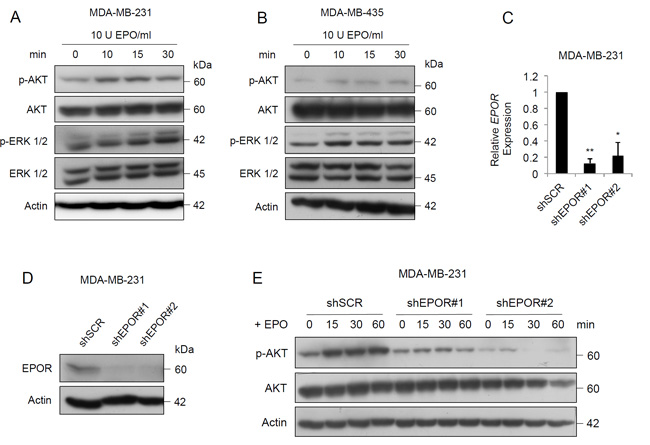 Figure 1: EPO activates PI3K/AKT and MAPK signaling pathways in breast cancer cells. A. Immunoblot of signaling induced by 10 U EPO/ml in MDA-MB-231 cells and B. MDA-MB-435 cells. C. EPOR mRNA expression in MDA-MB-231-shSCR, MDA-MB-231-shEPOR#1 and MDA-MB-231-shEPOR#2 cells, generated by infection of pLKO.1-scramble (shSCR), pLKO.1-shEPOR#1 (shEPOR#1) and pLKO.1-shEPOR#2 (shEPOR#2), harvested 72 hours after lentiviral transduction. Data shown are means ± SEM. shSCR vs shEPOR#1, **p = 0.0037; shSCR vs shEPOR#2, *p = 0.0391 by paired t test. D. Immunoblot of EPOR in MDA-MB-231-shSCR, MDA-MB-231-shEPOR#1 and MDA-MB-231-shEPOR#2 cells, harvested 72 hours after lentiviral transduction. E. Time course analysis of p-AKT and AKT following the addition of 10 U/ml EPO.