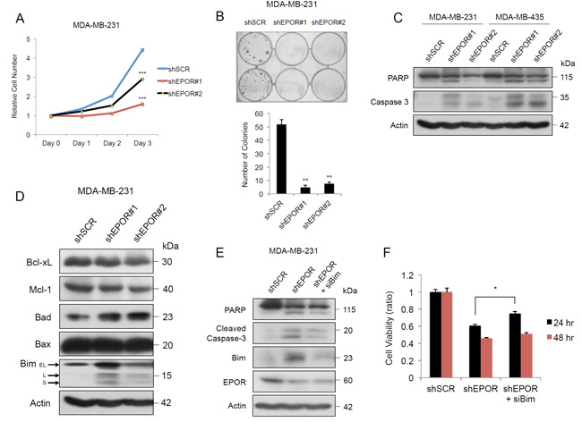 Figure 2: EPOR is essential for growth and prevents apoptosis in breast cancer cells. A. Growth curve of MDA-MB-231 cells transduced with shSCR, shEPOR#1, or shEPOR#2 measured by MTT colorimetric assay to determine cell viability. shSCR vs shEPOR#1, ***p = 0.0003 at Day 3. shSCR vs shEPOR#2, ***p < 0.0001 at Day 3. B. Clonogenic assay of MDA-MB-231-shSCR, MDA-MB-231-shEPOR#1 and MDA-MB-231-shEPOR#2 cells. Colony number was quantified in three independent replicates after 5 days. shSCR vs shEPOR#1, **p = 0.002; shSCR vs shEPOR#2, **p = 0.0041. C. Immunoblots of PARP and Caspase 3 in MDA-MB-231-shSCR, MDA-MB-231-shEPOR#1 and MDA-MB-231-shEPOR#2 cells, and MDA-MB-435-shSCR, MDA-MB-435-shEPOR#1 and MDA-MB-435-shEPOR#2 cells harvested 72 hours after transduction. D. Immunoblots of apoptosis-related genes in MDA-MB-231-shSCR, MDA-MB-231-shEPOR#1 and MDA-MB-231-shEPOR#2 cells, harvested 72 hours after transduction. E. Immunoblots of cleaved forms of PARP and Caspase 3 in MDA-MB-231-shSCR, MDA-MB-231-shEPOR#1 and MDA-MB-231-shEPOR#1/siBim dual knockdown cells. Cell lysates were prepared 72 hours after knockdown. F. MTT activity of MDA-MB-231-shSCR, MDA-MB-231-shEPOR#1 and MDA-MB-231-shEPOR#1/siBim dual knockdown cells. Relative cell numbers were determined by MTT assay at both 24 and 48 hours. shEPOR#1 vs shEPOR#1/siBim at 24 hours, *p = 0.0121.