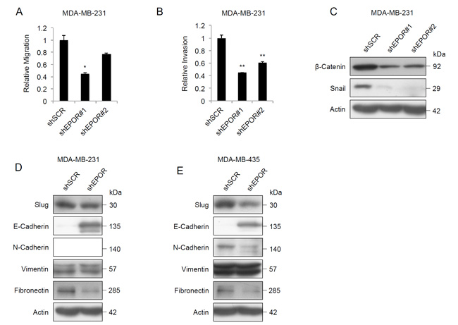 Figure 4: Effect of EPOR knockdown on migration, invasion and EMT protein expression. A. In vitro migration in MDA-MB-231-shSCR, MDA-MB-231-shEPOR#1 and MDA-MB-231-shEPOR#2 breast tumor cells, measured as the relative migration through membrane inserts with 8 µm pore size, after 24 hours. Data shown are mean fold changes ± SEM for three independent replicates, *p < 0.05, paired t test. B. In vitro invasion in MDA-MB-231-shSCR, MDA-MB-231-shEPOR#1 and MDA-MB-231-shEPOR#2 cells, measured as the relative invasion through Matrigel-coated invasion chamber inserts with 8 µm pore size. Cells seeded in the upper chamber were allowed to migrate through a Matrigel-coated membrane for 24 hours using fetal bovine serum as chemoattractant. Data shown are mean fold changes ± SEM for three independent replicates, **p < 0.01, paired t test. C. Immunoblot of β-catenin and Snail in MDA-MB-231-shSCR, MDA-MB-231-shEPOR#1 and MDA-MB-231-shEPOR#2 cells. Total protein was harvested 72 hours after viral transduction. (D,E) Immunoblots of Slug, E-cadherin, N-cadherin, Vimentin and Fibronectin in D. MDA-MB-231-shSCR and MDA-MB-231-shEPOR#1 cells and in E. MDA-MB-435-shSCR and MDA-MB-435-shEPOR#1 cells. Total protein was harvested 72 hours after viral transduction.