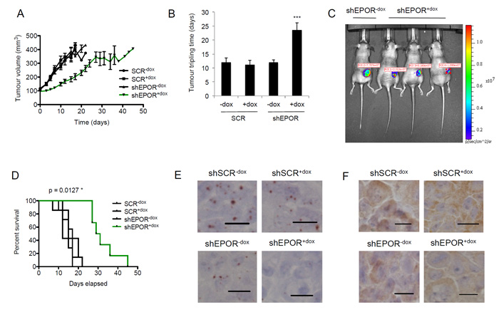 Figure 5: Effect of EPOR knockdown on breast tumor growth in vivo. A. Tumor volume measurements of mice in the four subgroups, shSCR-dox (n = 7), shSCR+dox (n = 7), shEPOR-dox (n = 7) and shEPOR+dox (n = 6), following the commencement of doxycycline and EPO treatment at 100 mm3 tumor volume. B. Tumor tripling time in days for the tumor to grow from 100 mm3 to 300 mm3. ***p < 0.0001 for shEPOR+dox vs shSCR-dox ; shEPOR+dox vs shSCR+dox ; shEPOR+dox vs shEPOR-dox ; and shEPOR+dox vs shEPOR-dox, Bonferroni’s Multiple Comparison Test. All other comparisons between subgroups were non-significant (NS). C. In Vivo Imaging System (IVIS) time-matched images of one shEPOR-dox mouse (left lane) and three shEPOR+dox mice on Day 15. D. Kaplan-Meier plot of the survival time in shSCR-dox, shSCR+dox, shEPOR-dox and shEPOR+dox animals. Mice were culled when the tumor volume reached 400 mm3; *p = 0.0127, log-rank (Mantel-Cox) test. E. RNAscope® analysis of EPOR expression in representative tumors from shSCR-dox, shSCR+dox, shEPOR-dox and shEPOR+dox mice. Scale bar represents 10 µm. F. Immunohistochemical analysis of EPOR expression, using the anti-EPOR antibody GM1201, in representative tumors from shSCR-dox, shSCR+dox, shEPOR-dox and shEPOR+dox mice. Images were taken at x40 magnification. Scale bar represents 10 µm.