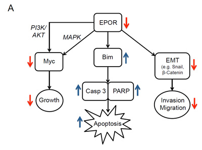 The effects of EPOR knockdown on both cell lines are summarized in Figure 6. After EPOR knockdown Myc is decreased, and is associated with decreased cell growth, increased apoptosis, and changes in EMT-related proteins linked to decreases in invasive and migratory capacity.
