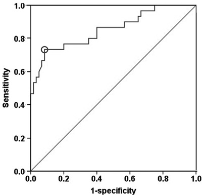 Figure 3: ROC curve analysis. PSP/reg predicts the incidence of DKD. The 30.4 ng/mL cut-off reveals a sensitivity of 73.3 % and a specificity of 91.7 % to predict the incidence of DKD.
