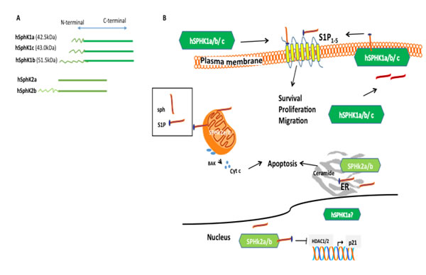 Figure 2: Subcellular distribution of SphK isozymes and function. A. SphK is expressed as two isozymes designated SphK1 and SphK2. Each SphK isozyme has variant isoforms differing only at the N-terminus. B. The distinct functions of hSphK1 and hSphK2 isozymes are believed to be associated with subcellular localization. SphK2 isoforms are predominantly localized in the nucleus, mitochondria, and endoplasmic reticulum (ER) and produce S1P. While located at the ER, SphK phosphorylates sphingosine to S1P, conversely, S1P phosphatase removes the phosphate and S1P lyase degrades S1P to induce apoptosis. In the mitochondria, Sphk2 catalysis to produce S1P triggers the apoptotic pathway by activating BAK and Cyt C. Conversely, hSphK1 is predominantly located in the cytoplasm and translocates to the membrane upon activation. Upon activation, hSphK1a/b/c phosphorylates sphingosine to produce S1P and has an “inside/outside” mechanism whereby S1P is translocated outside the cell and can bind to S1P1-5 receptors (also referred to as G-coupled receptors) contributing mainly to cell survival. HSphK1 isoforms have also been found extracellular. In mice, SphK1 isoform b has been shown to be located to the plasma membrane and more susceptible to degradation, however, to-date, no distinction between hSphK1 isoform localization has been demonstrated in the different human cells and human tissue with the exception that hSphK1a has been shown to be distributed in the nucleus and cytoplasm in cell culture. Figure 2B has been adapted from [27].