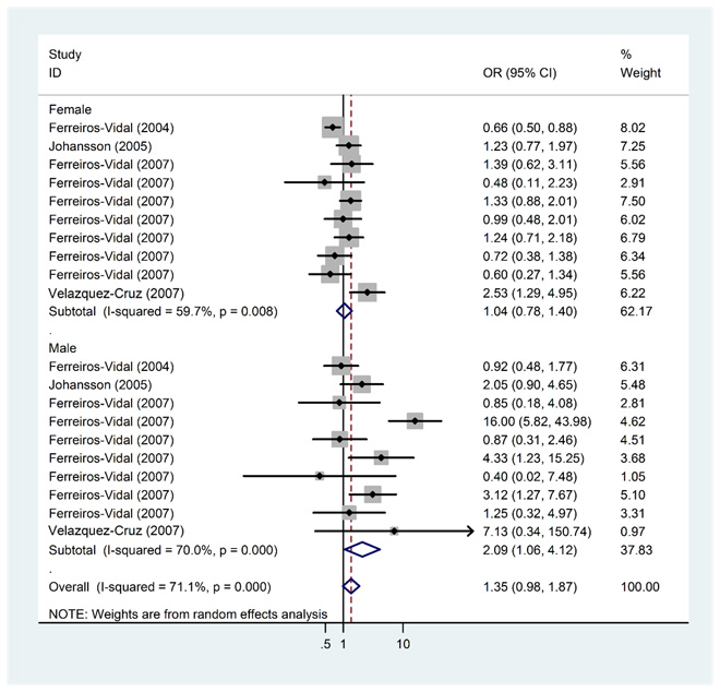 Figure 3: Meta-analysis and pooled relative risk of PD1.3 polymorphism and SLE risk with stratified analysis by gender under A vs G genetic model. CI = confidence interval, OR = odds ratio.