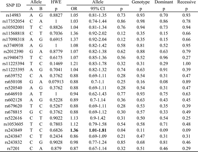 Table 2: The HWE and Chi-square test results in allele and genotype model of SNPs.