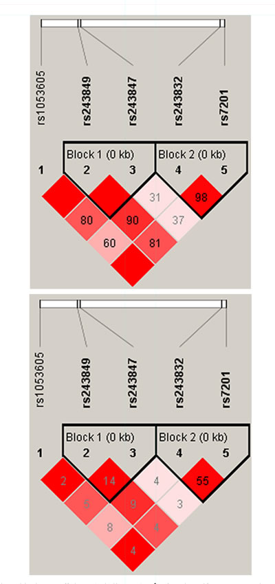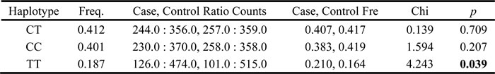 We using parameter D’ and r2 to measure the extent of linkage disequilibrium between SNPs, and according to the control group data to determine the haplotype LD block. From the Pearson Chi-square results, we found the haplotype block consisted by rs243849 and rs243847 exist statistically significant (p=0.039) (Figure 1 and Table 4). The result of the unconditional logistic regression model, we didn’t find a significant association between different haplotype blocks and alcohol-induced ONFH.