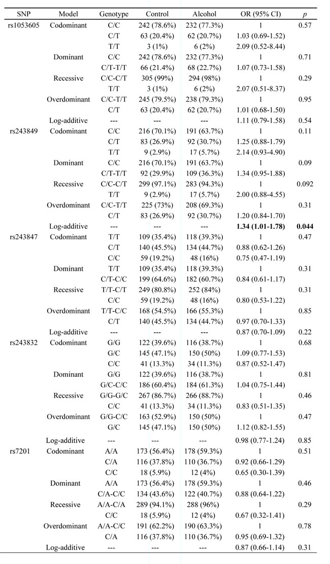 Table 3: Logistic analyses of SNPs association with alcohol-induced ONFH in without adjustment addition.