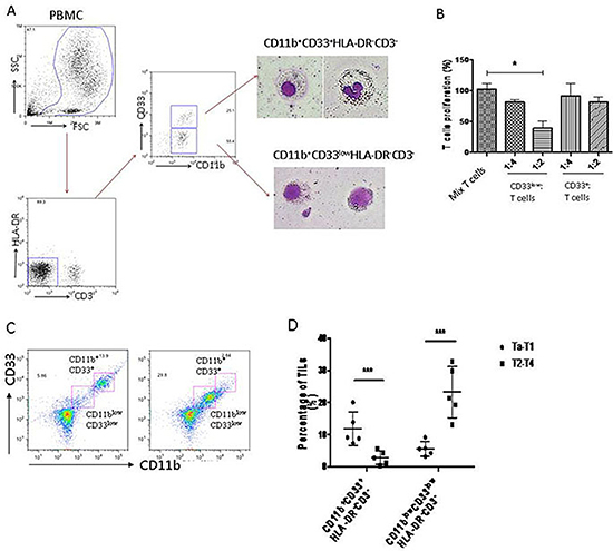 Figure 1: MDSCs of human bladder cancer are defined as CD11b+CD33lowHLA-DR−CD3− cells. (A) Flow cytometry was performed on freshly isolated PBMCs from BC patients. Morphological characterization of myeloid derived suppressor cells (MDSCs) sorted and analyzed by Giemsa staining. (B) Circulating CD11b+CD33lowHLA-DR−CD3− cells suppress autologous T cell proliferation at a 2:1 T cell/MDSC ratio (*P < 0.05). (C) MDSCs (CD11blow CD33lowHLA-DR−CD3−) were accumulated in tumor tissue of BC patients. (D) MDSCs (CD11blow CD33lowHLA-DR−CD3−) were dramatically higher in patients at stage of Ta-T1 than those at stage of T2-T4 (***P < 0.01) .