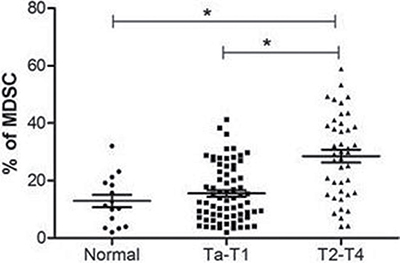 Figure 2: The percentage of MDSCs is increased in bladder cancer patients. The proportion of MDSCs in peripheral blood from BC patients was significantly increased compared with the proportion from healthy donors, and the level of MDSC was higher in BC patients at stage of T2-T4 than that of Ta-T1 (*P < 0.05).