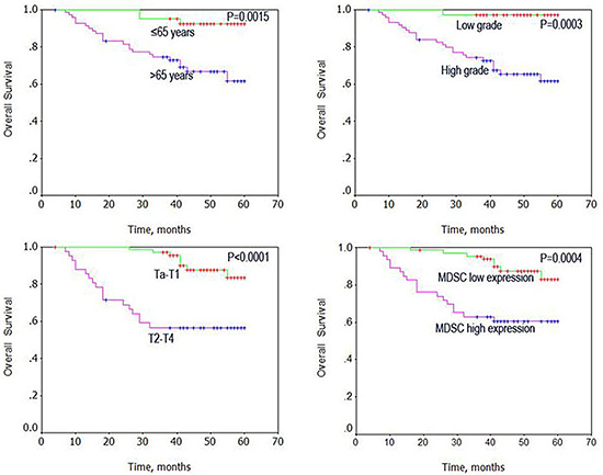 Using Kaplan–Meier analysis method, we observed that age, grade, stage, and high MDSCs levels correlated with OS (both P < 0.001, Table 2). The log-rank test further demonstrated that the overall survival time was associated with age, grade, stage, and high MDSCs levels (Figure 3). Multivariate analysis was also performed with the Cox proportional hazards model including gender, age, tumor size, number, grade, and stage, and the MDSCs levels. The results showed that the MDSCs levels correlated with BC prognosis, and were an independent prognostic factor for patients with BC (P = 0.006; Table 3)