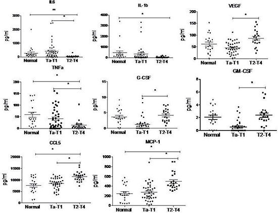 Figure 4: Cytokine levels in serum of BC patients analyzed by cytometric beads assay. The levels of VEGF, G-CSF, GM-CSF, CCL5 and MCP-1 are up-regulated while the levels of IL-6, IL-1b and TNFα are down-regulated in BC patients with T2-T4 stage, compared to BC patients with Ta-T1 stage and healthy control. (*P < 0.05)