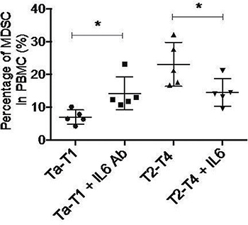 Figure 5: Down-regulation of IL6 is sufficient to induce MDSC formation in vitro. Adding exogenous IL6 to serum gotten from BC patients in T2-T4 stage significantly undermined the accumulation of MDSC, while adding IL6 neutralizing antibody (5E1) to serum of BC patients in Ta-T1 stage increased the number of MDSC(*P < 0.05).
