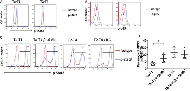To investigate the signaling pathways involved in the IL-6-mediated MDSCs differentiation, we examined the IL-6-induced activation of NF-κB (phosphorylation of p65) and Stat3 (phosphorylation of Stat3) pathways in CD11b+ myeloid cells in BC patients in T2-T4 and Ta-T1 stages. Phosphorylation of Stat3, but not p65, was decreased in BC patients in T2-T4 stages, compared to Ta-T1 stages (Figure 6A and 6B). To confirm the role of IL-6/Stat3 in the differentiation of MDSCs, we examined the levels of p-Stat3 in MDSCs induced by serum of BC patients. Figure 6C shows that Stat3 phosphorylation was decreased by adding serum from BC patients at stages T2-T4, and that it was regulated by adding IL-6 protein or IL-6 neutralizing antibody.