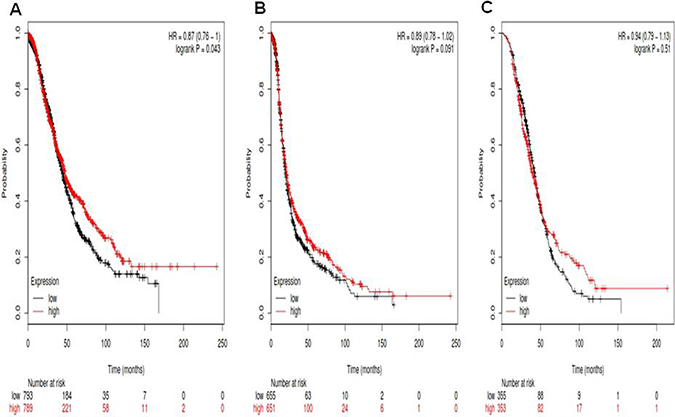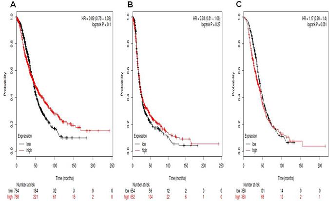 Figure 3: For Notch3, its Affymetrix ID is 203237_at. (A) OS curves are plotted for all ovarian cancer patients (n = 1,582). (B) PFS curves are plotted for ovarian cancer patients (n = 1,306). (C) PPS curves are plotted for ovarian cancer patients (n = 708).