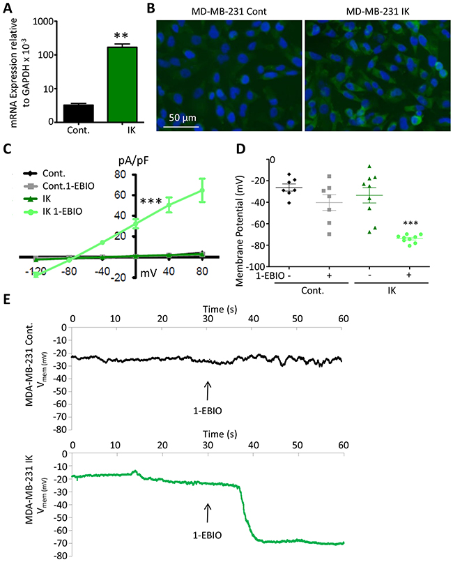 Figure 1: Functional contribution of IK over-expression to current density and Vmem. (A) IK mRNA expression levels relative to GAPDH in total RNA collected from MDA-MB-231 infected with pMIG-RFP (Cont.) or pMIG-IK (IK) and selected for RFP fluorescence by FACS. Data are presented as mean with standard error of the mean (SEM) of 3 independent replicates (** significant difference p < 0.01, 2 sample t-test). (B) MDA-MB-231 control or MDA-MB-231-IK were fixed on coverslips and immunofluorescence microscopy was performed using antibodies to IK (green) with DAPI (blue) staining of the nuclei. Increased intensity of the green IK staining is evident in the MDA-MB-231-IK sample. (C) Endogenous and 1-EBIO induced current-voltage relationship in control and IK-expressing cells recorded in the cell attached perforated patch configuration from MDA-MB-231 cells. Data are presented as mean ± SEM from a minimum of 7 recordings. The current density was significantly increased in MDA-MB-231-IK 1-EBIO treated cells as compared to control vehicle treated, control 1-EBIO treated, and MDA-MB-231-IK vehicle treated cells (*** p < 0.001, 1-way ANOVA of 0 mV current density) (D) Vmem averaged over 20 seconds from recordings of same cells as C. Data points represent individual cells, bars show mean with SEM (*** indicates significantly different than vehicle treated control p < .001, 1-way ANOVA). (E) Vmem recording of representative MDA-MB-231 control cell (top) and MDA-MB-231-IK cell (bottom) with bath solution exchanged to 1-EBIO solution beginning at 30 seconds and continuing through duration of recording. There is a ~7 second delay between when the solutions are changed and when the new solution reaches the cells.