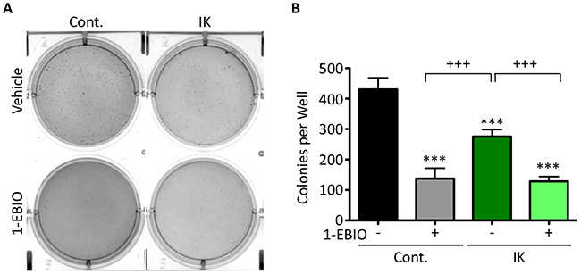 Figure 3: MDA-MB-231 soft agarose colony formation is decreased by both IK expression and IK activation. (A) Bright field images of crystal violet stained MDA-MB-231 control and MDA-MB-231-IK cells grown in soft agarose and treated with vehicle control or 1-EBIO for 28 days. (B) Quantification of colonies from A. Data presented as mean with standard deviation of three independent replicates, *** indicates significantly different than vehicle treated control, +++ significant difference between indicated samples (p < 0.001 1-way ANOVA).