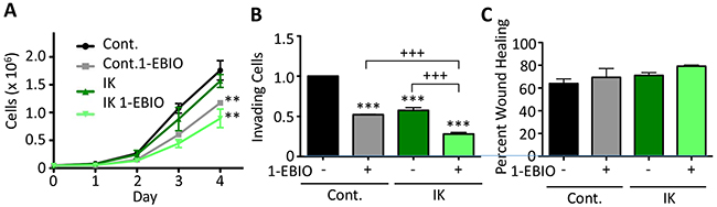 Figure 4: 1-EBIO treatment decreased MCF-10A proliferation and invasion but had no effect on migration. (A) Control and IK over-expressing MCF-10A proliferation was quantified over 4 days for cells treated with vehicle control or 1-EBIO (** p < 0.01 indicates significantly different than vehicle control, 1-way ANOVA). (B) Invasion through Matrigel-coated transwell after 24 h using horse serum and EGF as a chemoattractant. Average number of cells per field of view with 4 fields of view per sample and 4 replicates in each of 3 independent experiments (*** p < 0.001 indicates significantly different than vehicle treated control, +++ p < 0.001 indicates significant difference between indicated samples, 1-way ANOVA). (C) A confluent layer of MCF-10A control or MCF-10A-IK was scratched and treated with vehicle control or 1-EBIO. Healing was assessed after 12 h by quantifying the surface area of wound recovery (no significant difference across all conditions; p = 0.28, 1-way ANOVA). All data presented as mean with SEM of three independent replicates.