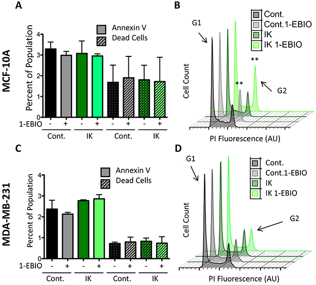 Figure 5: 1-EBIO treatment increased G2 phase accumulation in MCF-10A but had no effect on MDA-MB-231. Control and IK over-expressing MCF-10A (A) and MDA-MB-231 (C) cells were treated with vehicle control or 1-EBIO for 24 h, stained with annexin-FITC and violet dead stain, and analyzed by flow cytometry to quantify the percentage of positively stained cells (no significant difference in annexin-V or dead stained cells across any condition, 1-way ANOVA). (B, D) Plot of cell count versus propidium iodide (PI) fluorescence to analyze cell cycle. Arrow marks fluorescence intensity corresponding to G2 phase. Plot is representative of three independent replicates (MCF-10A **p < 0.01, MDA-MB-231 p = 0.29, 1-way ANOVA). All data presented as mean with SEM of three independent replicates.