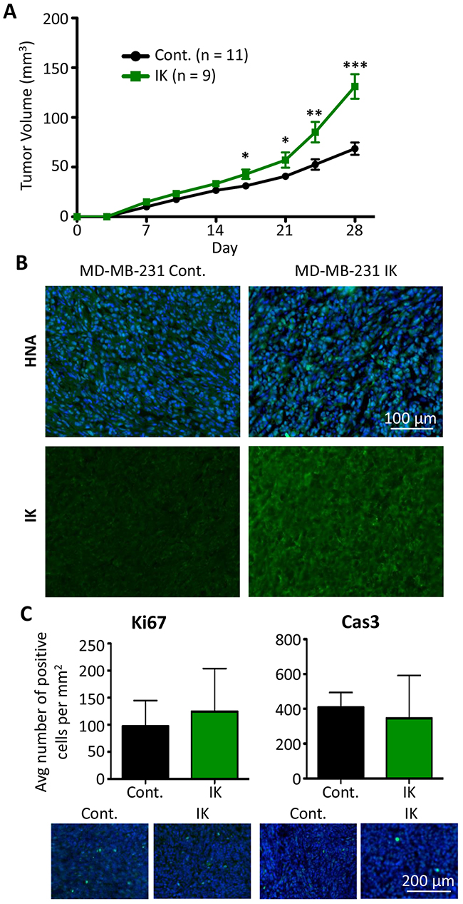 Figure 6: IK over-expression increases in vivo tumor growth of MDA-MB-231. (A) MDA-MB-231 control (n = 11) and MDA-MB-231-IK (n = 9) cells were injected into the inguinal mammary fat pad of 6 wk old female mice and tumor size was plotted over time. Data presented as mean with SEM (* p < .05, ** p < .01, ***p < .001 2 sample t-test). (B) Fixed primary tumor sections stained with antibody to human nuclear antigen (green) with DAPI (blue) staining of the nuclei (top) or with anti-IK antibody (green; bottom). (C) Quantification of Ki67 positive (left) and active Caspase-3 positive (right) cells in primary tumor sections with representative images of Ki67 and active caspase-3 (green) staining with DAPI (blue) staining of the nuclei shown below. There was no significant difference in the percentage of either Ki67 or active caspase-3 positive cells (p = 0.27, 2-sample t-test and p = 0.15, 2-sample t-test).