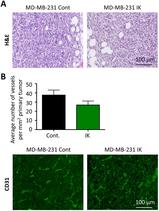 We next investigated whether the primary tumors also displayed differences in aggressive phenotypes. Staining of primary tumor sections with H&E revealed similar local invasion into surrounding muscle and fibroadipose tissue from both MDA-MB-231 control and MDA-MB-231-IK primary tumors (Figure 7A). To assess vascular density, primary tumor sections were stained with the endothelial marker CD-31 and the number of vessels per square millimeter was quantified. There was no significant difference in the vascular density between control and MDA-MB-231-IK tumors and surprisingly if anything there was a trend towards denser vascularization in control cells (p = 0.14, 2-sample t-test, Figure 7B).
