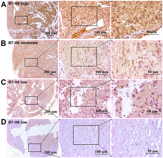 Figure 1: Immunohistochemical staining of B7-H6 in human glioma tissues. B7-H6 expression detected by using immunohistochemical staining in human glioma tissues, and the positive B7-H6 staining could be found on the membrane and in the cytoplasm of cancer cells. (A) High B7-H6 expression in human glioma tissues. (B) Morderate B7-H6 expression in human glioma tissues. (C) Low B7-H6 expression in human glioma tissues. (D) Low B7-H6 expression in adjacent normal tissue. Scale bar = 200μm in left panel, scale bar = 100μm in middle panel, scale bar = 50μm in right panel.