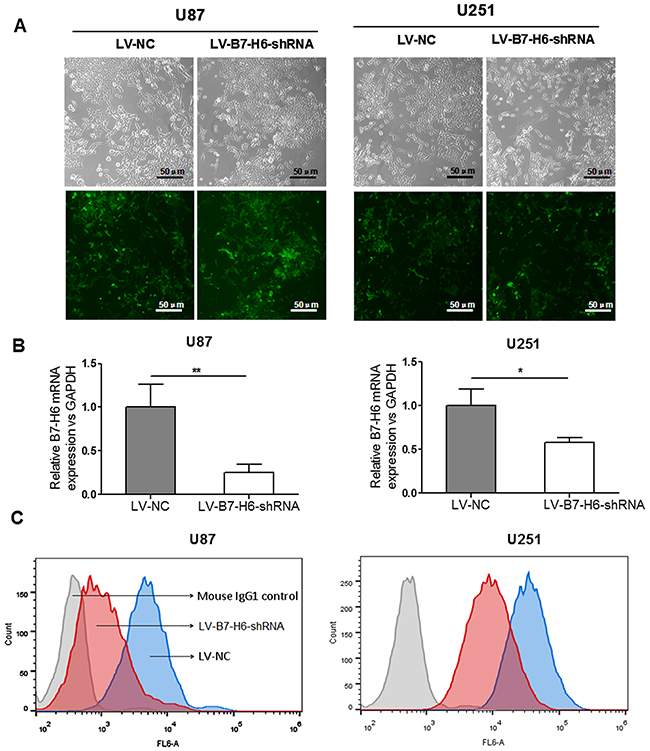 Figure 2: Confirmation of B7-H6 knockdown efficiency in human glioma cell lines. (A) Confirmation of infection efficiency of glioma cell lines with recombinant lentivirus vector containing B7-H6 shRNA, through GFP expression analysis using fluorescence microscopy. (B) Validation of the B7-H6 mRNA expression after knock-down in U87 and U251 cells by using real-time RT-PCR analysis. (C) Validation of the B7-H6 mRNA expression after knock-down in U87 and U251 cells by using flow cytometry analysis.