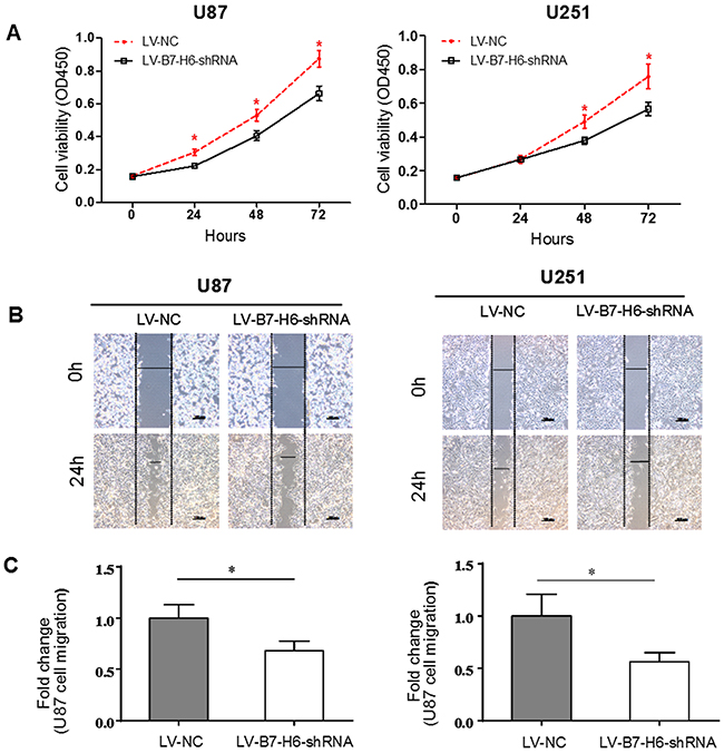 Figure 3: Effect of B7-H6 knockdown on glioma cells proliferation and migration. (A) Analysis of cell proliferation in U87 and U251 cells in LV-NC and LV-B7-H6-shRNA groups by using CCK-8 assay. We examined the knockdown expression of B7-H6 on the cell proliferation rate in vitro by using CCK-8 assay in human glioma cell lines in both LV-B7-H6-shRNA and LV-NC groups. At 48 hours and 72 hours after seeding, the proliferation rate of LV-B7-H6-shRNA group cells was significantly lower than that of LV-NC group cells (P<0.05 respectively). (B) and (C). The wound healing assay on the two human glioma cell lines in LV-B7-H6-shRNA group and LV-NC group showed that, the cell-free area of the LV-B7-H6-shRNA group was significantly wider than that of LV-NC group at 24 hours (both P<0.05) after drawing the scratch line on the monolayer cells.