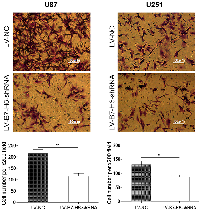 Figure 4: Effect of B7-H6 knockdown on the invasive ability of glioma cells. The transwell invasion assay showed that the number of invaded cells stained with Cristal Violet was significantly less in the LV-B7-H6-shRNA group in contrast to the LV-NC group (U87: P<0.01, U251: P<0.05, respectively).