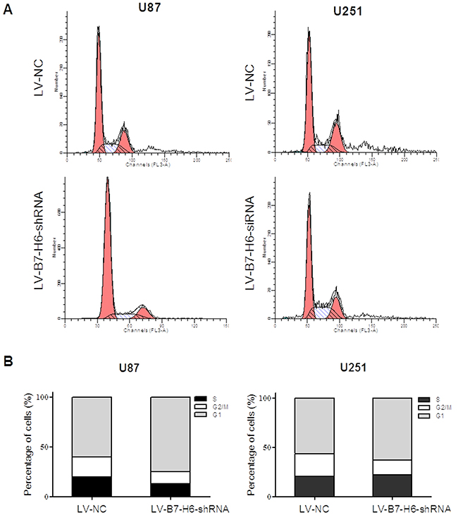 Finally, we tested the role of B7-H6 expression in glioma cell apoptosis and cell cycle regulation. As shown in Figure 5A and 5B, the cell death analysis using PI-AnnexinV staining revealed that down-regulation of B7-H6 expression in both U87 and U251 cell lines significantly increased the percentage of apoptotic cells in the LV-B7-H6-shRNA group as compared to LV-NC group (P<0.05). Furthermore, the cell cycle analysis results showed that, the cells from the LV-B7-H6-shRNA group, in both U87 and U251 cell lines, displayed increased percentage of cells in the G1-phase and decreased percentage in G2/M phases, in comparison to cells from LV-NC group (Figure 6). This data indicated that B7-H6 knockdown induced cell cycle arrest in glioma cells. Moreover, the results from the siRNA method treated cells also confirmed that B7-H6 knockdown could also lead to the increased percentage of cells in the G1-phase and decreased percentage in G2/M phases (Supplementary Figure 4).
