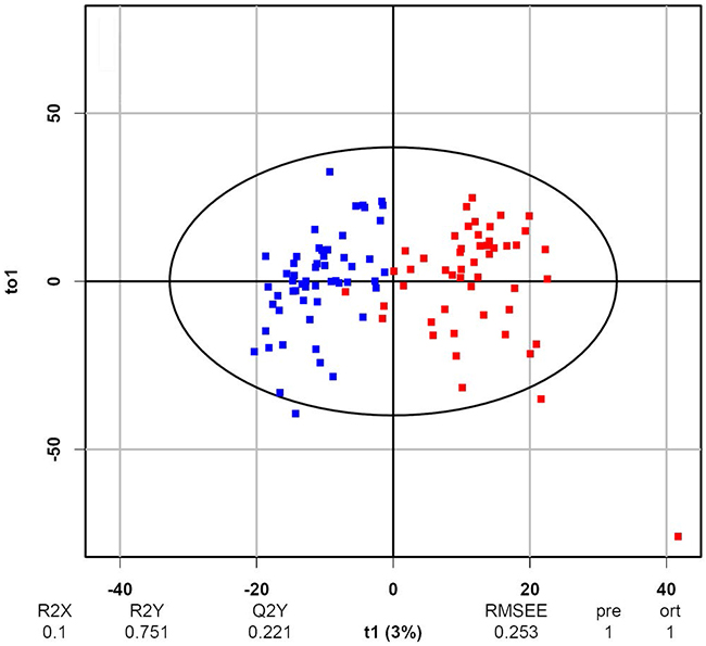 The urine samples of the 152 enrolled patients were subjected to the UPLC-TOF-MS analysis for metabolomic profiling, and 944219 spectral ions were identified for each sample (see Supplementary Tables 1–4 for BCa samples and Supplementary Tables 5–7 for hernia samples). To test whether or not UPLC-TOF-MS-based metabolomic profiling be an effective approach to discriminate BCa samples from hernia samples, we used the metabolomic profiles of the training set to construct an OPLS-DA [18] model with one predictive component and two orthogonal components. The obtained OPLS-DA score plot was depicted in Figure 1. The satisfactory separation (R2Xcum = 0.1, R2Ycum = 0.751, Q2cum = 0.221) between BCa and hernia samples in the plot showed the discriminative potential of metabolomic profiling in BCa detection.