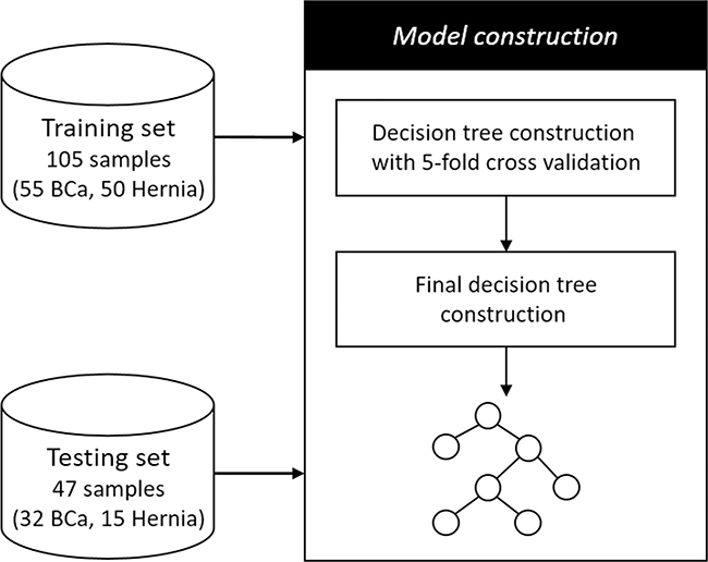 Figure 3: The decision tree construction and evaluation workflow. First, the training set of 55 BCa and 50 hernia samples was subjected to a procedure of decision tree construction with 5-fold cross validation to evaluate the stability and generalization of the decision tree model. Second, the whole training set was used to build a final decision tree. Finally, an independent test was performed on the testing set of 32 BCa and 15 hernia samples to validate the final decision tree.