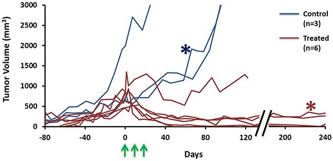 Figure 1: Hypofractionated SBRT caused tumor growth delay. A549 tumor growth curves for nine rats (Blue: control, n=3; Red: treatment, n=6). Tumors initially showed expected exponential growth. Three doses of 12 Gy irradiation (green arrows) caused effective control and shrinkage in most cases. The representative tumors used in Figures 2 and 3 are marked with red and blue *, respectively.
