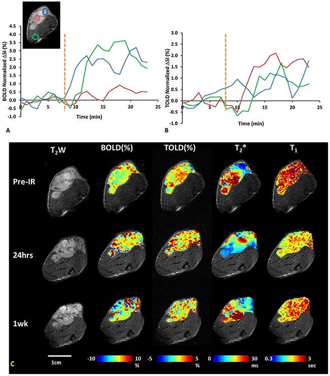 Figure 2: Oxygen sensitive MRI of a representative A549 lung tumor with respect to irradiation. (A) ΔSI curves showing BOLD, and (B) TOLD responses for three ROIs indicated on T2w-image (blue tumor periphery, red tumor center and green adjacent muscle). Yellow dotted line indicates transition from air to oxygen breathing. (C) T2w-images and overlaid parametric maps showing %ΔSI of BOLD and TOLD, T2* and T1 maps (left to right) of tumor (0.5 cm3) before, 24 hours and one week after 1st dose of radiation (12 Gy).