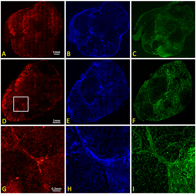 Figure 7: IHC of control and irradiated subcutaneous A549 human lung tumor xenografts. Upper panel: Contiguous sections showing control tumor (A) vasculature based on CD31 immunohistochemistry, (B) tumor perfusion based on Hoechst 33342 distribution, and (C) hypoxia based on immunohistochemistry for perfused pimonidazole. Lower panel: (D-F) corresponding whole mount sections from tumor 24 hours after single dose of 12 Gy. Magnified sections (white box in D) are shown in (G, H) and (I).
