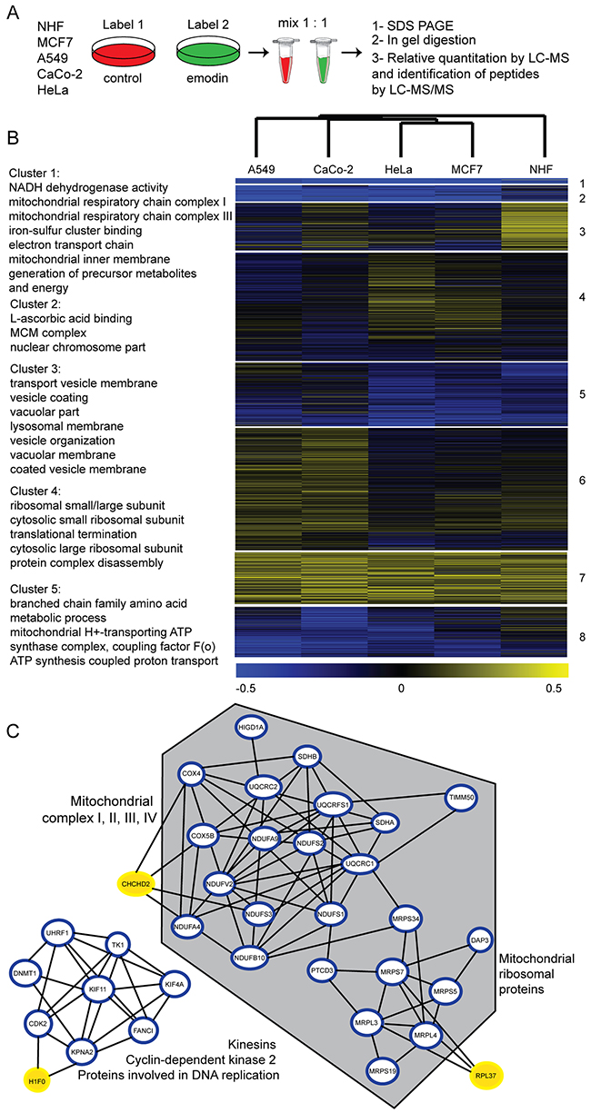 Figure 3: Expression proteomic analysis of cells treated with emodin. (A) Chemoproteomics workflow. Cells were treated for 24 h by 70 μM emodin. (B) Heat map of log2 transformed SILAC ratios of cells treated with emodin compared to respective controls (two biological replicates each). k-means clusters and shared GO terms of each cluster are described on the left (4 fold enrichment, p-value < 0.05). (C) Interaction network of significantly altered proteins in at least two cell types. Grey hexagon indicates mitochondrial proteins, blue circled proteins are significantly down-regulated and yellow-marked proteins are significantly up-regulated under emodin treatment (p<0.05).