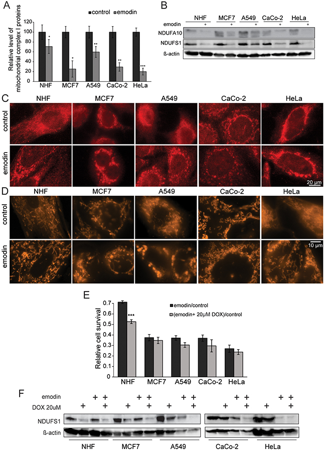 Compared to healthy cells, mitochondria in cancer cells function less efficiently leading to higher basal ROS levels in cancer cells (Supplementary Figure 7). To determine the role of mitochondrial fitness in the cellular response to emodin, we used doxycyclin (DOX), an antibiotic known to affect mitochondria by binding to the 28S mitochondrial ribosome subunit [20–22]. We treated cells prior to emodin treatment with DOX and evaluated their response. Notably, DOX pretreatment of cells rendered healthy cells more sensitive to emodin, while cancer cells were not significantly affected (Figure 4E). By western blot we show that DOX diminished levels of NDUFS1, which were even more decreased by emodin (Figure 4F). These experiments clearly indicate that good mitochondrial fitness is a prerequisite to overcome the effects of emodin treatment.