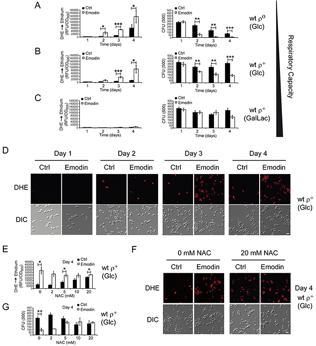 Figure 5: Yeast cells with low respiratory capacities demonstrate critical ROS accumulation upon emodin treatment culminating in loss of cell survival. (A-C) Wild-type ρ+ strain with intact mtDNA and ρ0 strain lacking mtDNA were tested for cytotoxic effects of emodin. ρ0 strain was grown on medium with glucose (Glc) as carbon source (fermentation only) (A), and wild-type ρ+ strain was either grown on media with glucose (Glc) as carbon source (respiration is possible but repressed by glucose) (B) or on media with galactose/lactate (Gal/Lac) as carbon source (high respiratory rates) (C). Yeast cells were tested for ROS levels (DHE to ethidium conversion; relative fluorescence unit (RFU) vs. cell mass (OD600); left panels) and for cell survival (colony forming unit, CFU; right panels) without and with 50 μM emodin, respectively, at days 1, 2, 3, and 4 after begin of treatment. Data shown here a mean values of seven experiments. (D) Representative micrographs of ROS accumulation as quantified in (B). (E-G) Wild-type ρ+ strain was grown on medium with glucose as carbon source for four days without and with 50 μM emodin in the presence of increasing concentrations of NAC. ROS accumulation (E, F) and cell survival (G) at the different conditions. Data shown are mean values of three independent experiments. Error bars: standard deviation. Statistics: Unpaired two-tailed Student’s t-test. *: p < 0.05, **: p < 0.01. Scale bars in (D+F): 10 μm.
