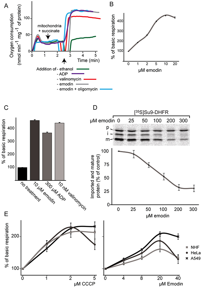 Figure 6: Effect of emodin on oxygen consumption and respiration in mitochondria, healthy and cancer cells. (A,B,C) Oxygen consumption of isolated yeast mitochondria under emodin treatment. (D) Import of an radiolabelled [35S]Su9-DHFR, a model protein targeted to the mitochondrial matrix, into isolated yeast mitochondria (p=precursor; i=intermediate; m=mature) in the absence or presence of different emodin concentrations. The lower panel displays quantifications of the mature (m) protein bands in three independent experiments. The signal obtained in the absence of emodin was set to 100%. Error bars represent SEM. (E) Comparison of respiration of healthy NHF, A549 and HeLa cells under emodin and CCCP treatment. Error bars represent SEM; n = 3.