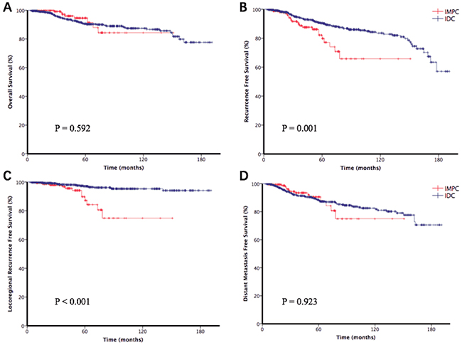 In conclusion, our data confirm that IMPC is characterized by aggressive clinicopathologic features, and that IMPC patients have poorer RFS and LRRFS than IDC patients. Additionally, the presence of IMPC was an independent prognostic factor for LRRFS in breast cancer. Thus, breast carcinoma specimens should be tested for the presence of this specific tumor subtype, and therapeutic plans should be adjusted according to the results of those tests. Additional studies, especially large-scale prospective studies that also examine genomic expression, are needed to help establish more optimal management guidelines for this uncommon histological variant of breast carcinoma.