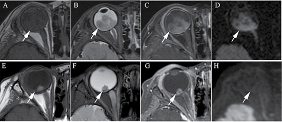 All data were analyzed with the Statistical Package for the Social Sciences (SPSS) software package, version 18.0 (SPSS, Chicago, IL, USA). Paired samples t-tests were used to assess pair-wise comparisons of quantitative MRI data (tumor size, ADC values, and the size of eyeballs following treatment). Independent sample t-tests were used to compare the tumor size, including the MSCA, AL, and ED before or after treatment. Chi-square test were used to analyzed the count data. Statistical significance was defined as P values < 0.05.